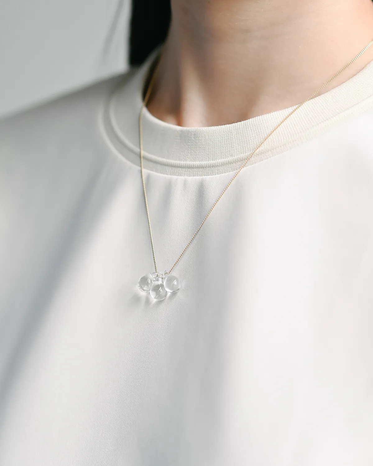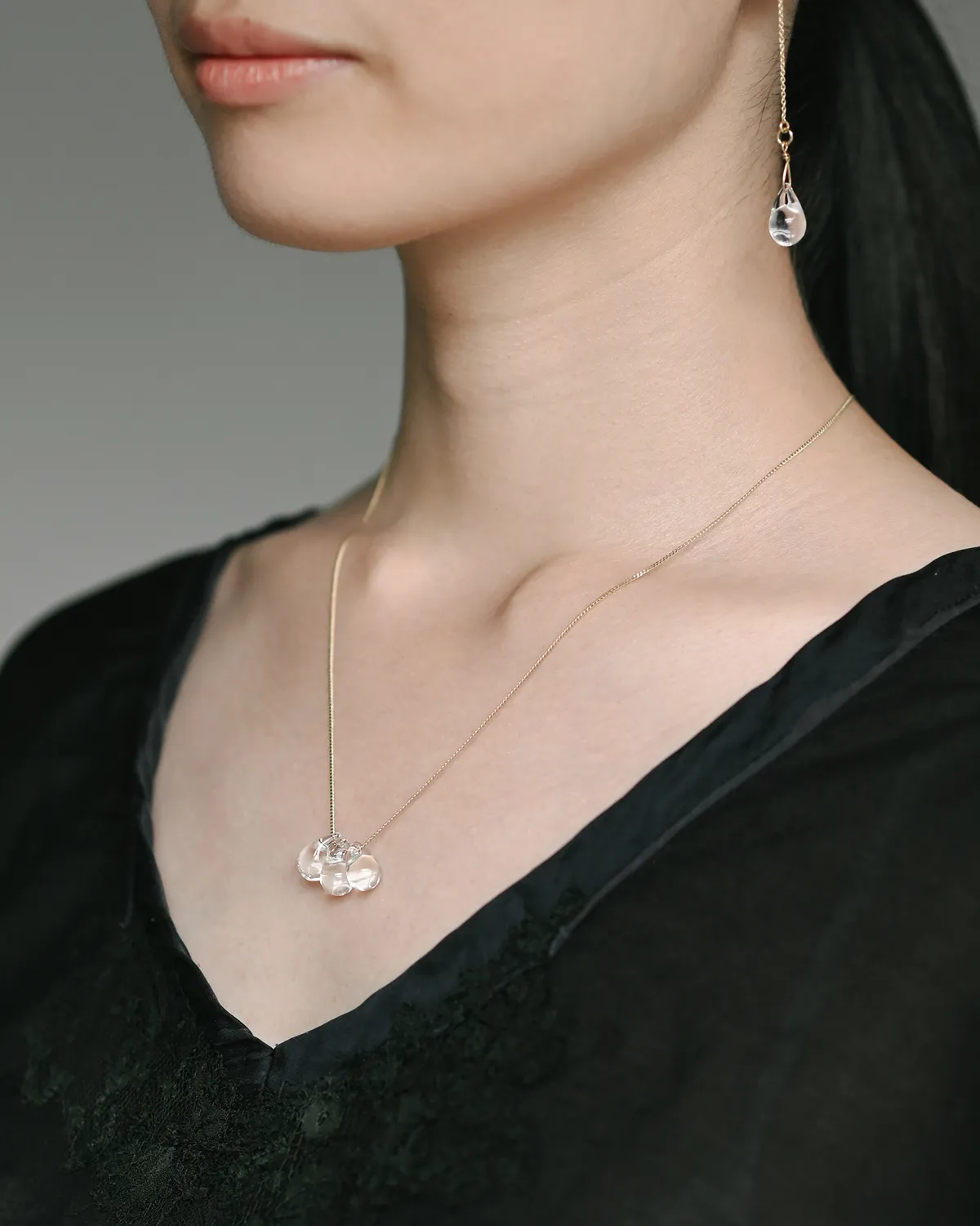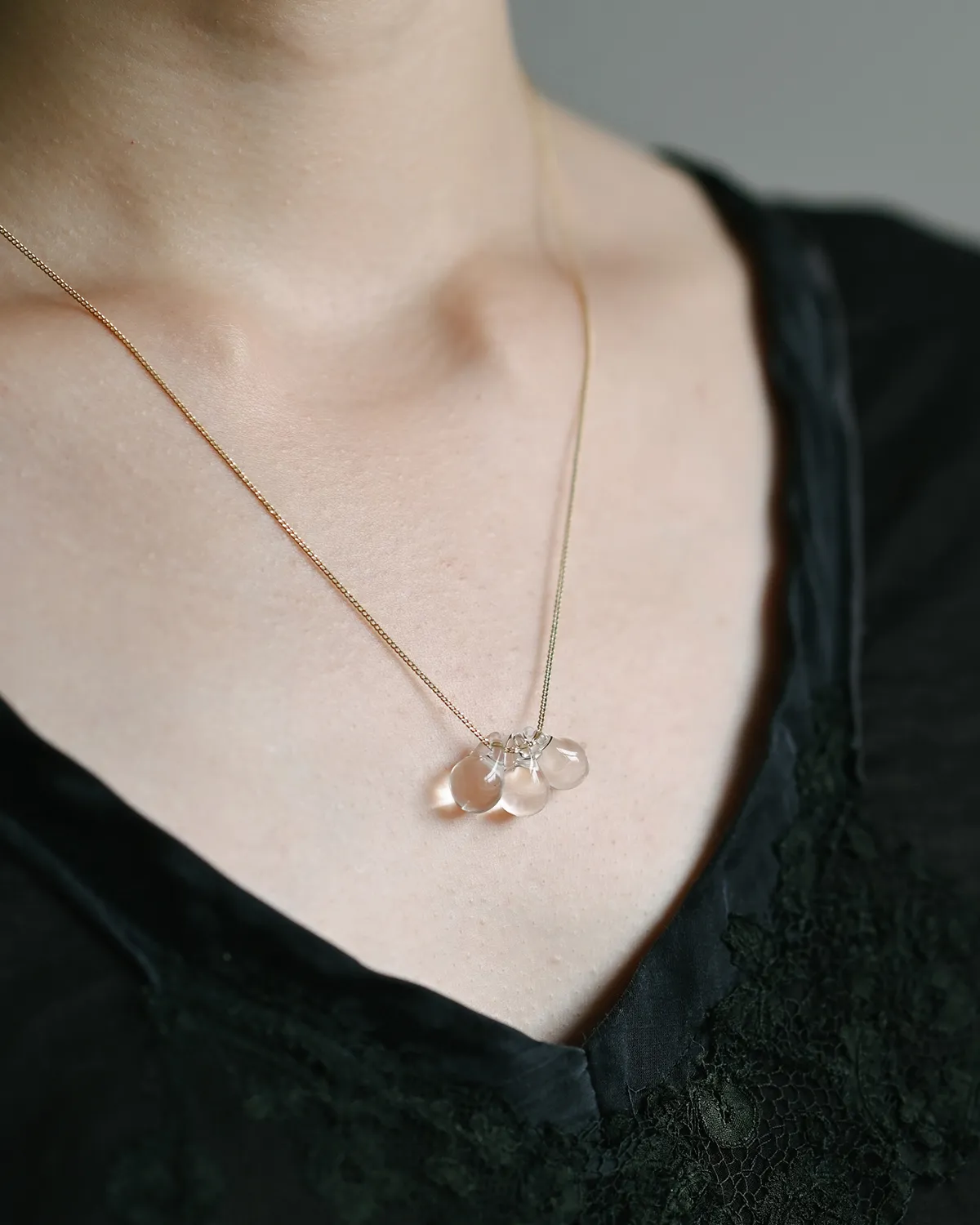 なみだ形のビーズが、胸元でキラキラと光を集めます。
