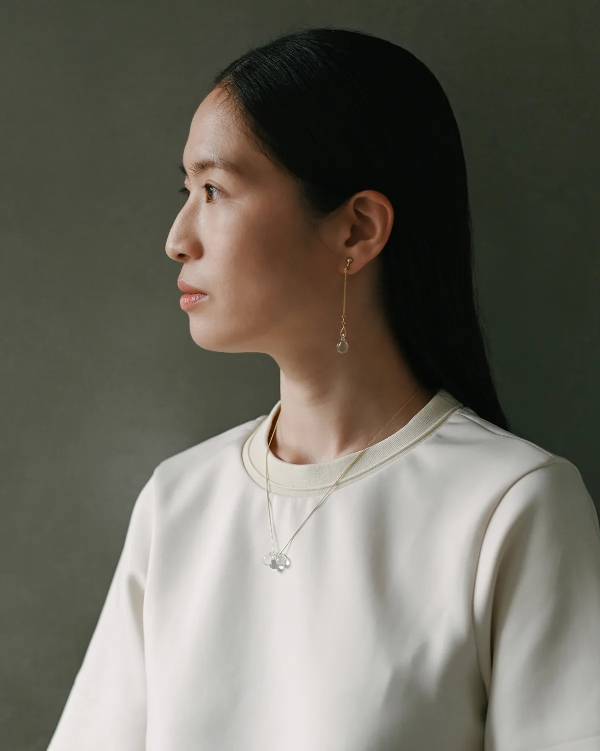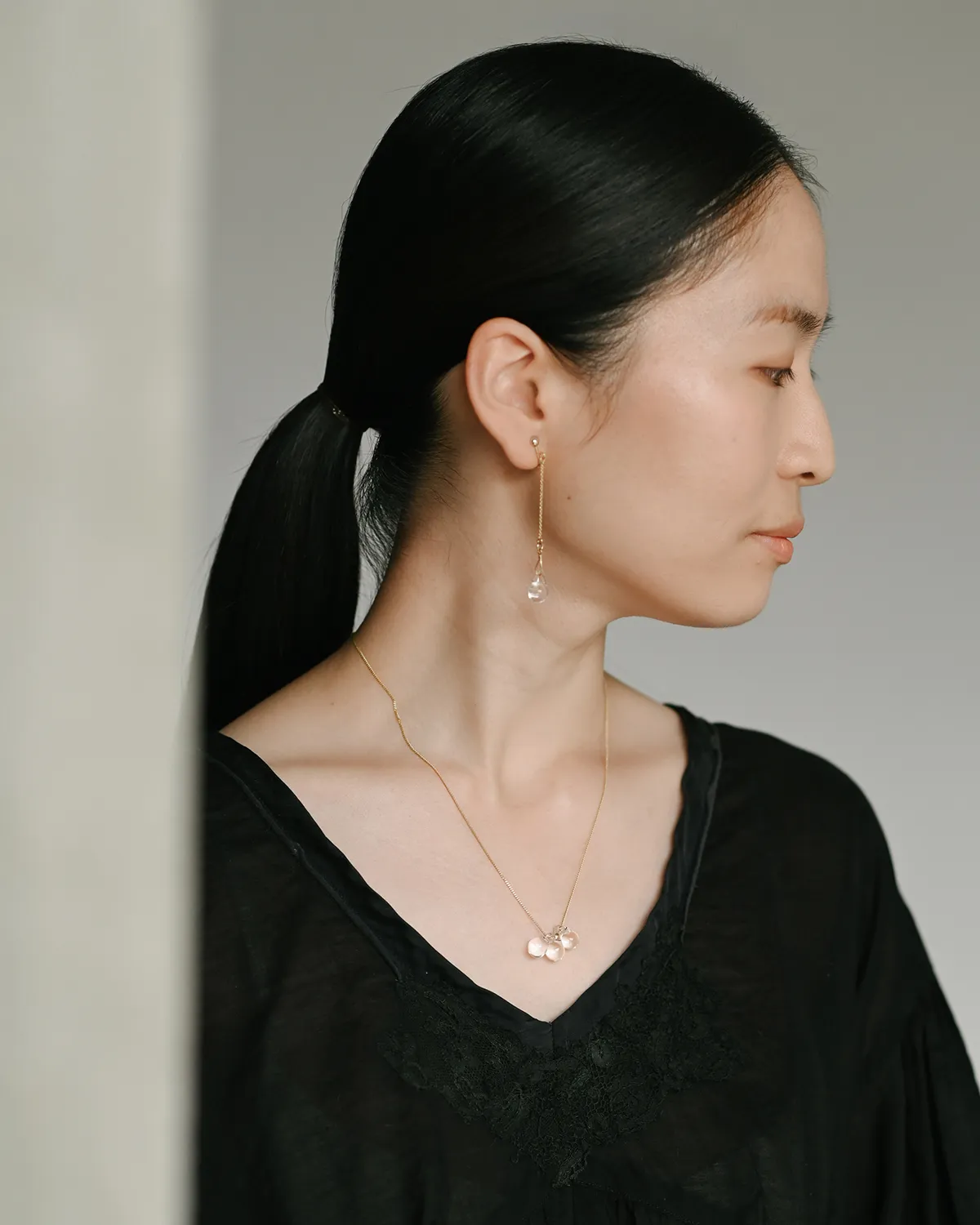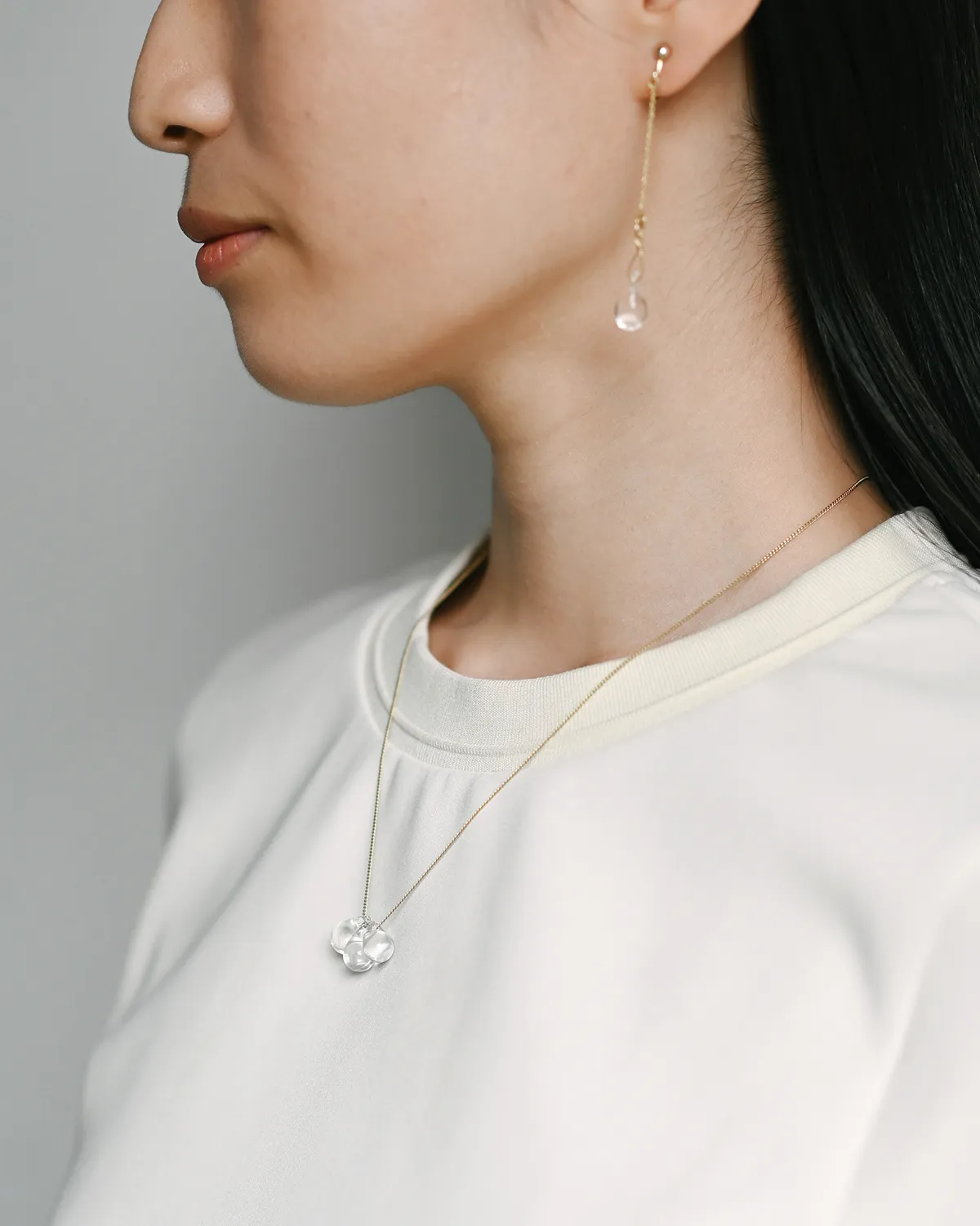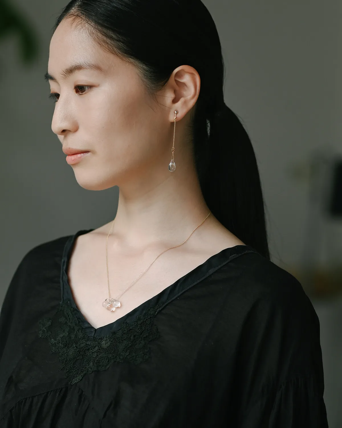 なみだ形のビーズが、胸元でキラキラと光を集めます。
