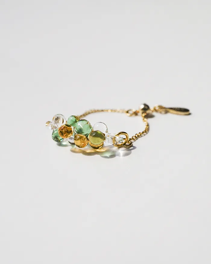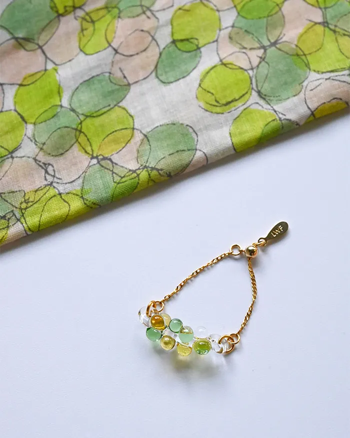 イイダ傘店の繊細で鮮やかなテキスタイルをガラスで表現した、生き生きと輝くガラスのアクセサリー。