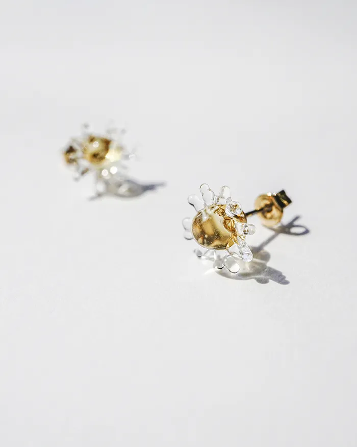イイダ傘店の繊細で鮮やかなテキスタイルをガラスで表現した、生き生きと輝くガラスのアクセサリー。