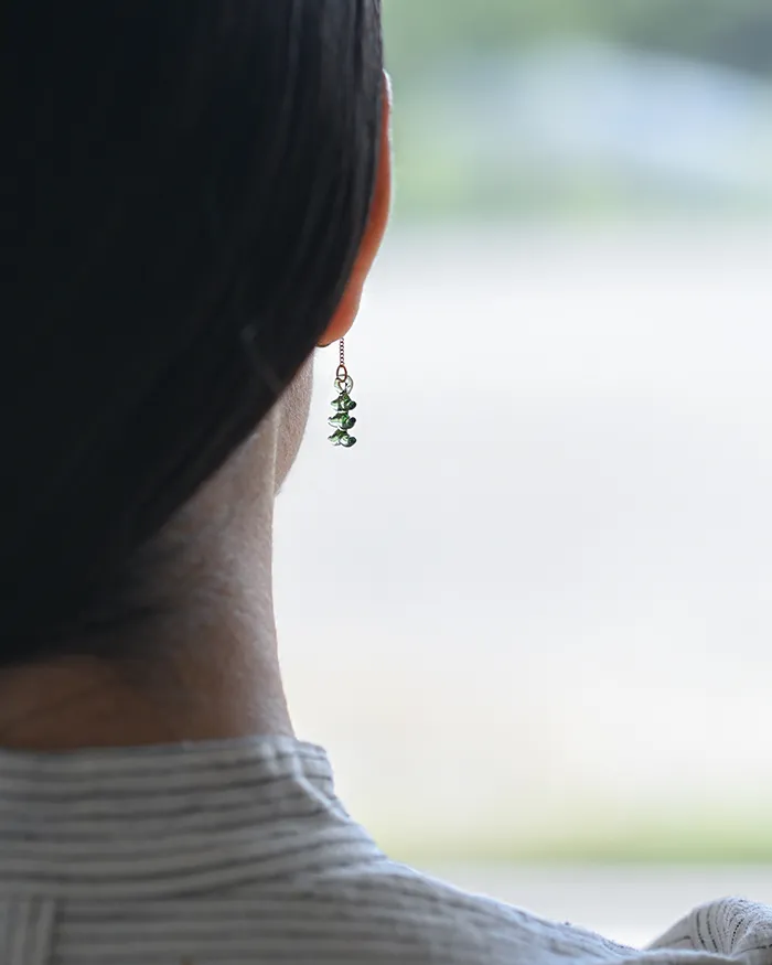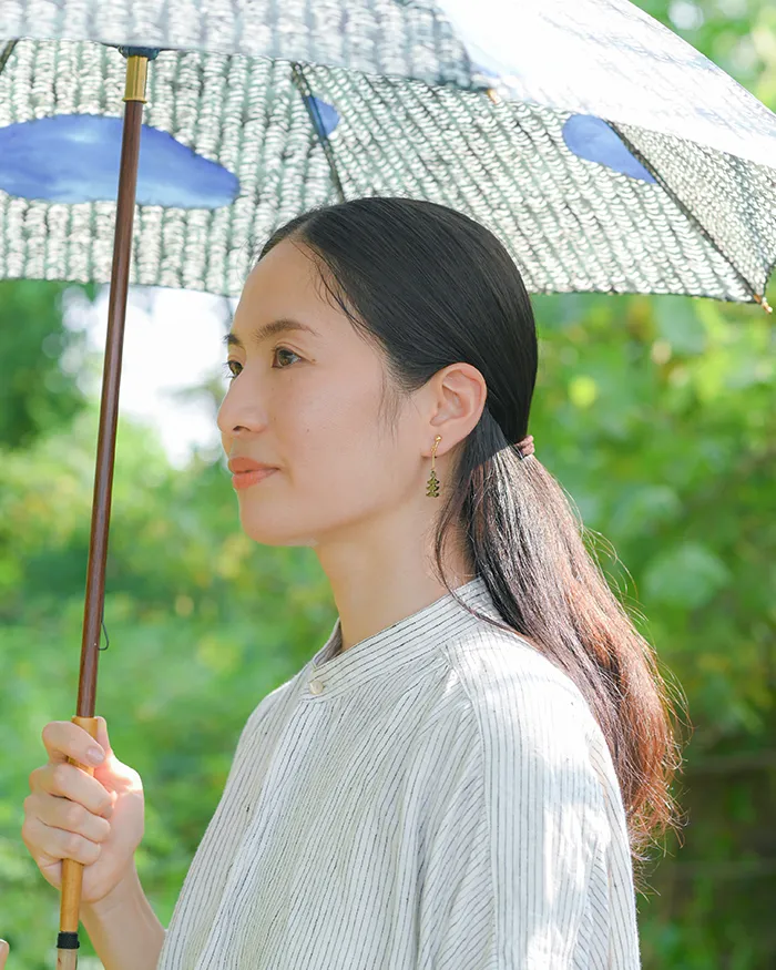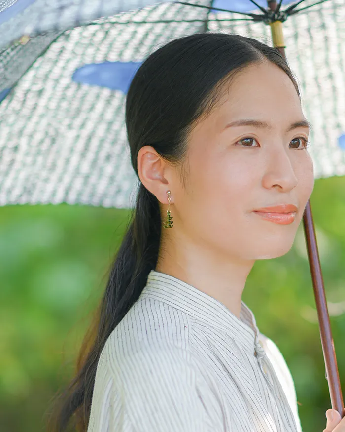 イイダ傘店の繊細で鮮やかなテキスタイルをガラスで表現した、生き生きと輝くガラスのアクセサリー。