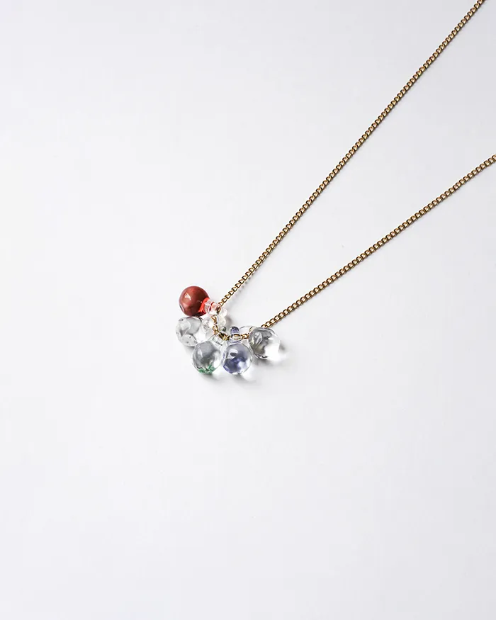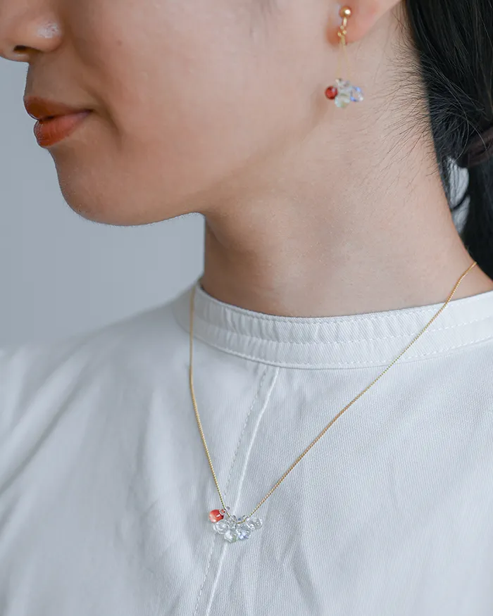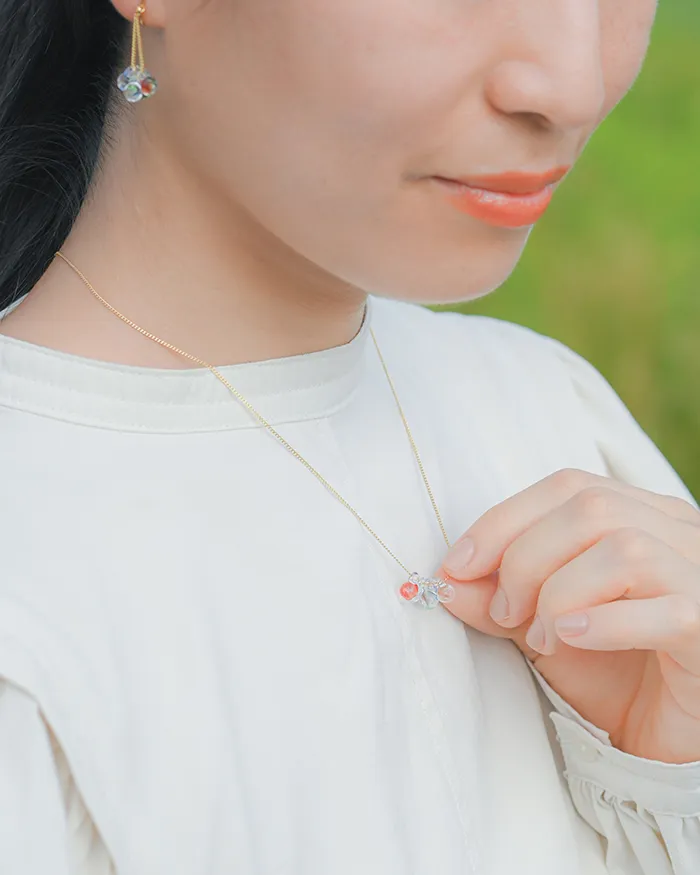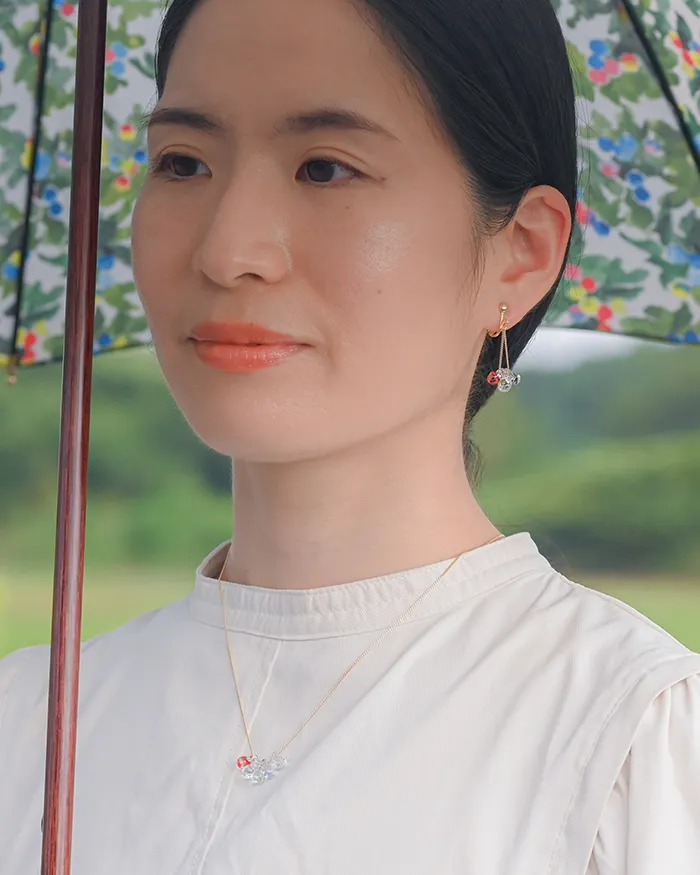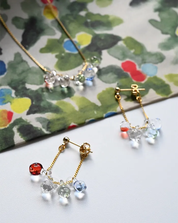 イイダ傘店の繊細で鮮やかなテキスタイルをガラスで表現した、生き生きと輝くガラスのアクセサリー。