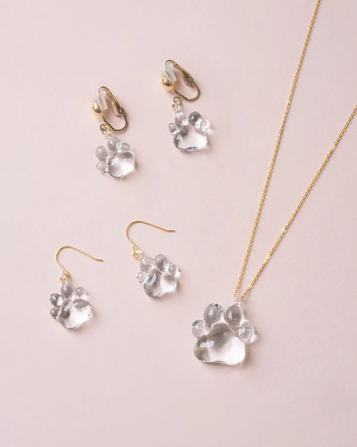 ぷにぷにの肉球のガラスアクセサリー。子犬のかわいらしい肉球が胸元できらきらと輝きます。
