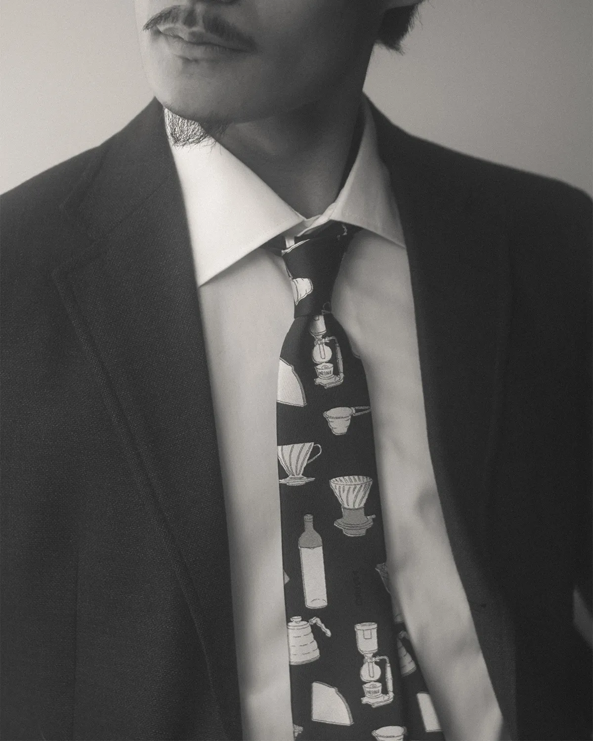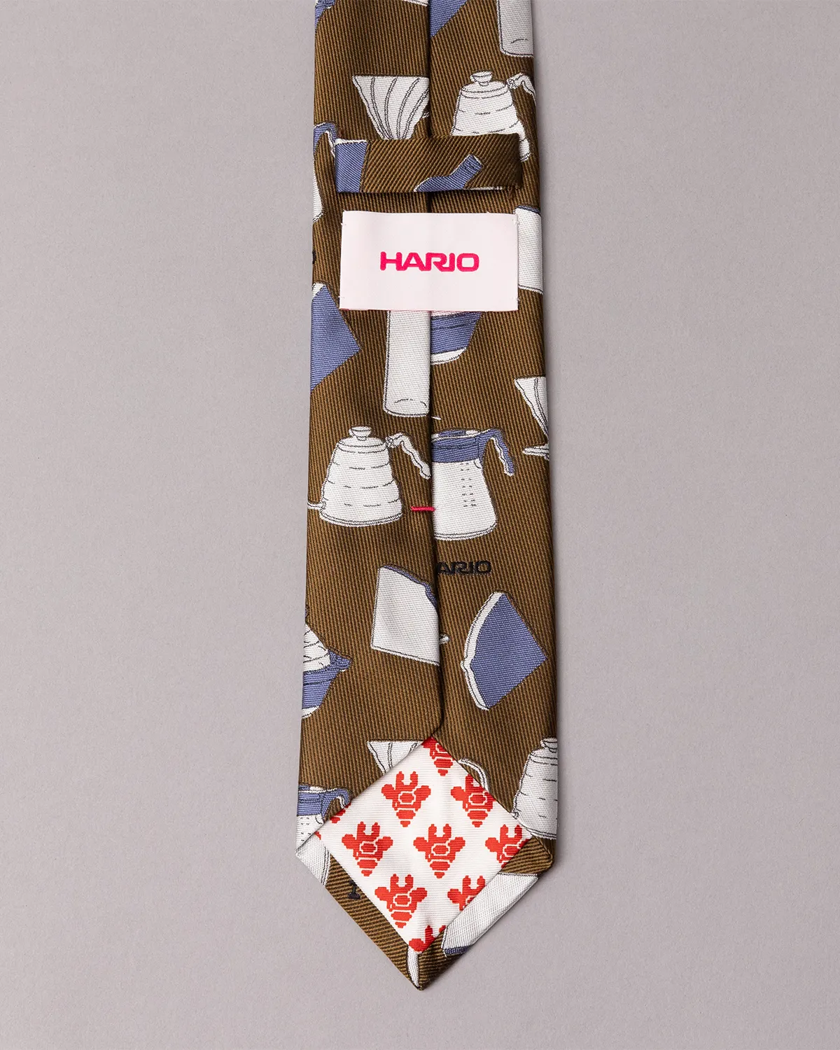 HARIOのコーヒー・紅茶の器具のイラストが、ネクタイの柄として表現されています。