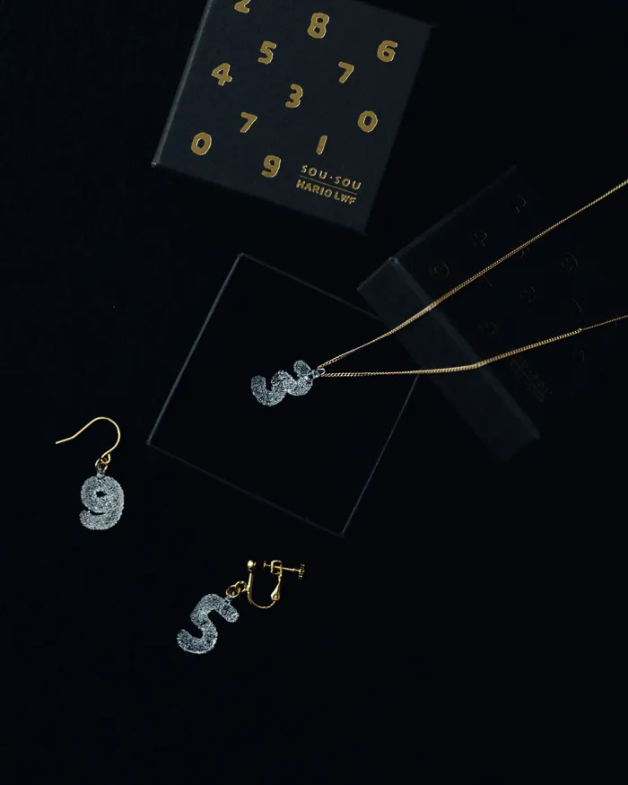SOU・SOUのポップであたたかみのあるテキスタイルのデザインが、HARIOのガラス職人の手によって、繊細に輝くガラスのアクセサリーになりました。