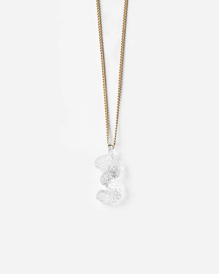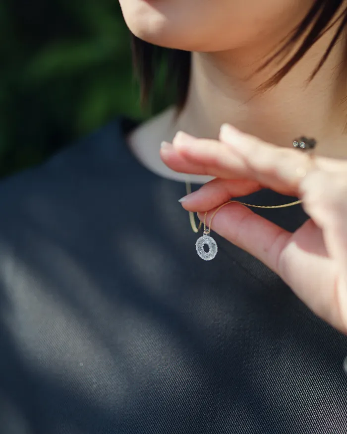 SOU・SOUのポップであたたかみのあるテキスタイルのデザインが、HARIOのガラス職人の手によって、繊細に輝くガラスのアクセサリーになりました。