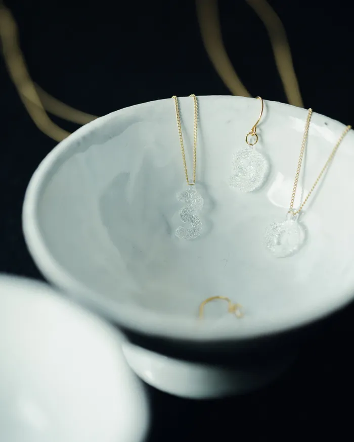 SOU・SOUのポップであたたかみのあるテキスタイルのデザインが、HARIOのガラス職人の手によって、繊細に輝くガラスのアクセサリーになりました。