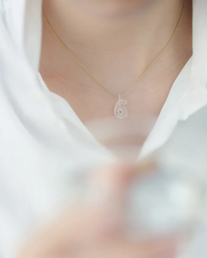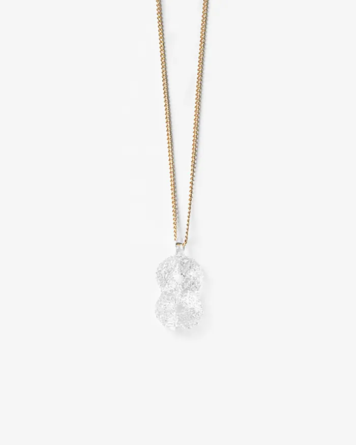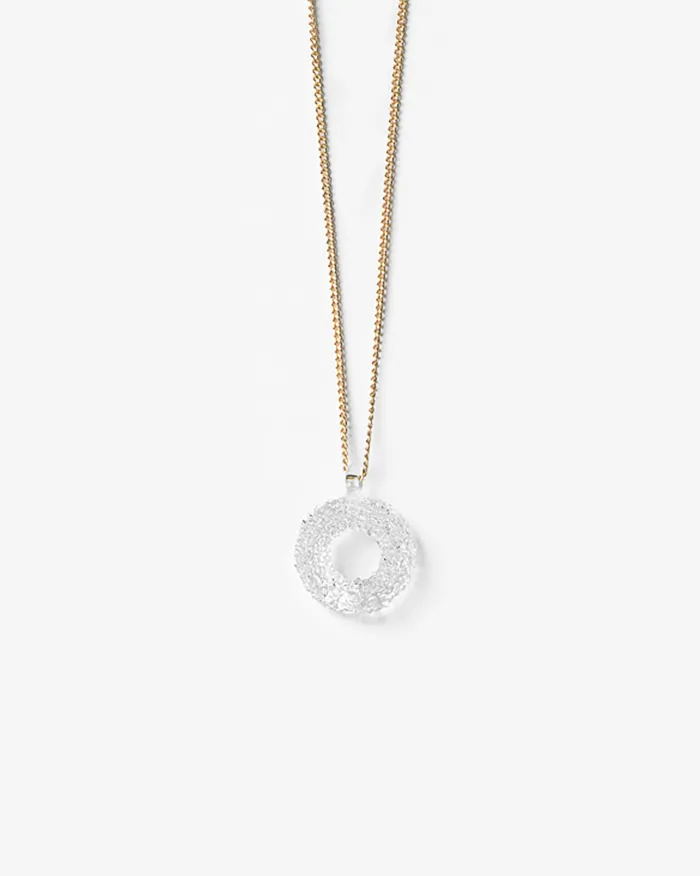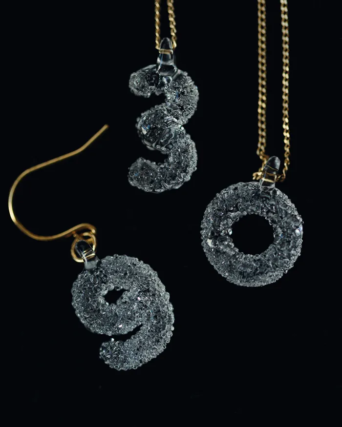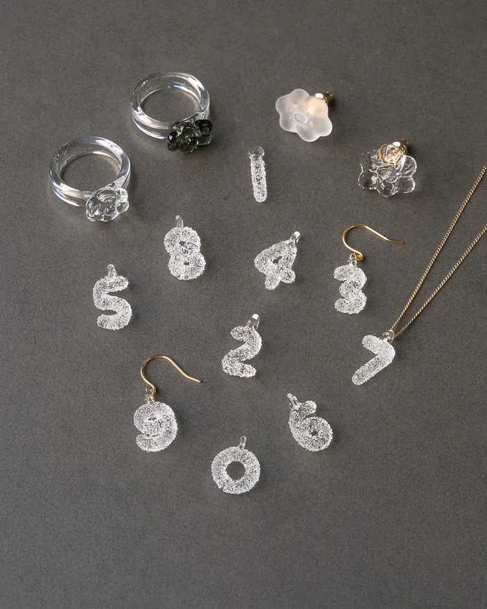 SOU・SOUのポップであたたかみのあるテキスタイルのデザインが、HARIOのガラス職人の手によって、繊細に輝くガラスのアクセサリーになりました。